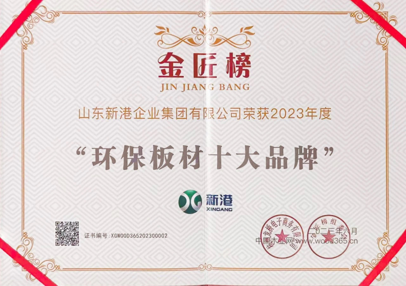 此次頒獎典禮,新港板材憑借優異的環保性能,榮獲“2023金匠榜環保板材十大品牌”。